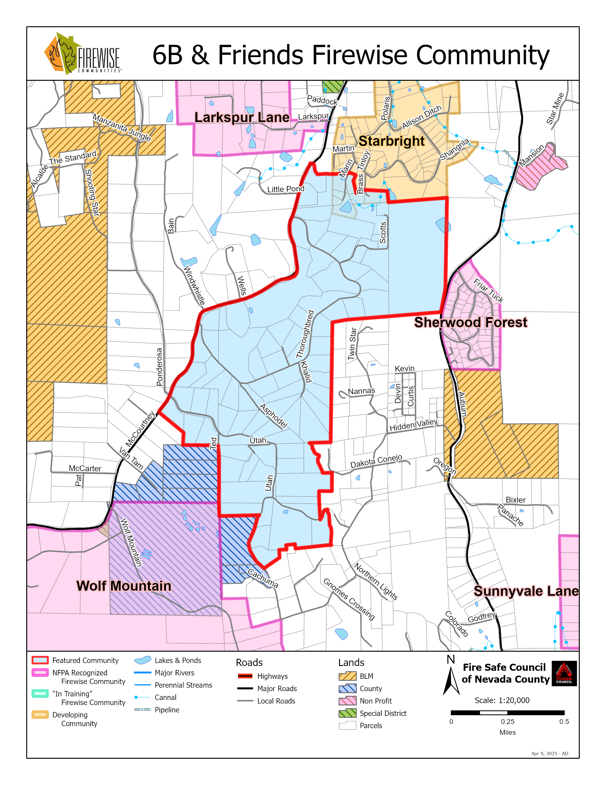 The 6B and Friends Firewise Community is comprised of 95+ parcels on Thoroughbred Loop, McCourtney Road, South Ponderosa Way, Brass Circle, Marin Place, Hidden Valley Road, Utah Road, Asphodel Close, Swaps Court, Khalid Court and Scotts Drive.
